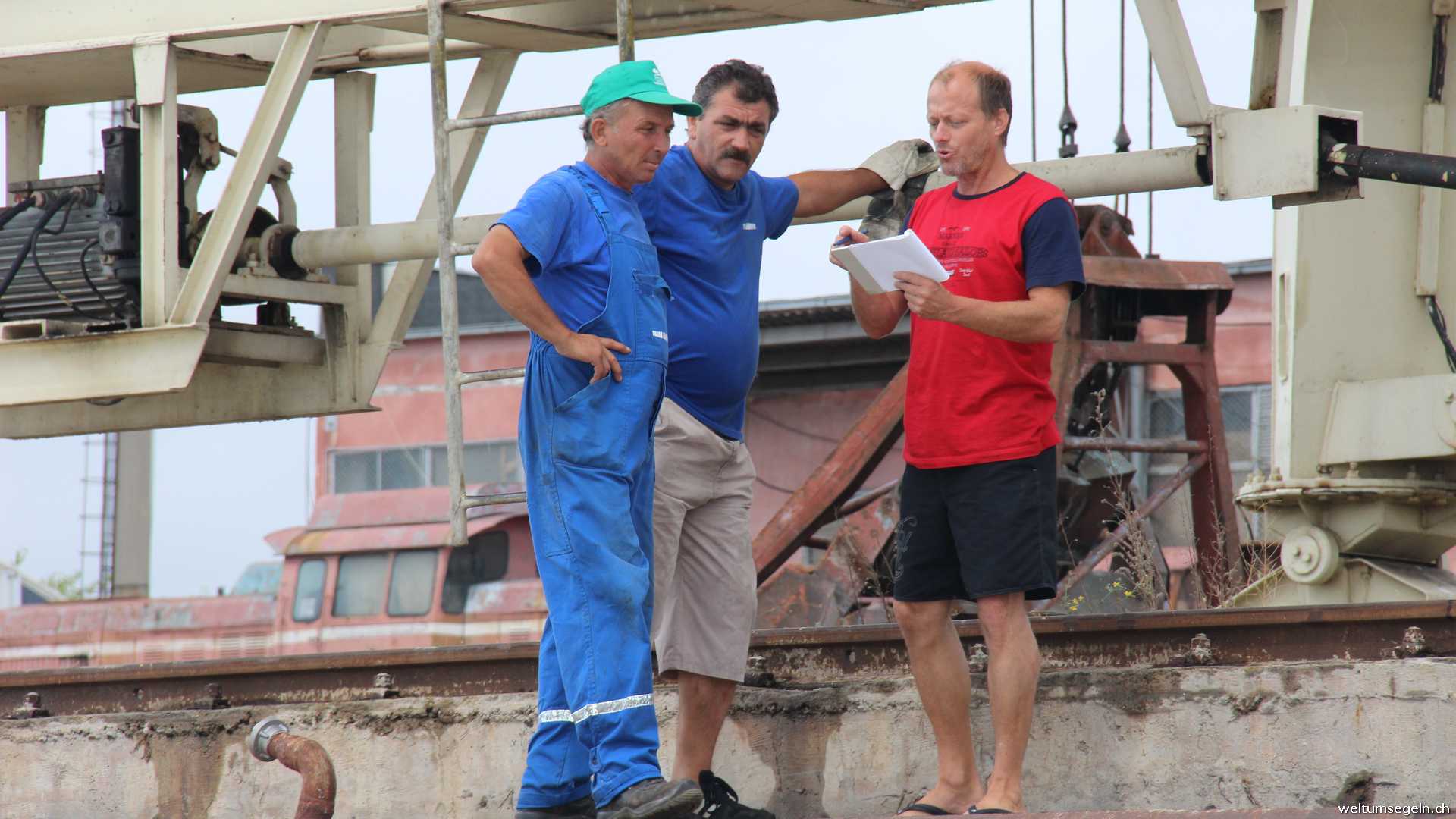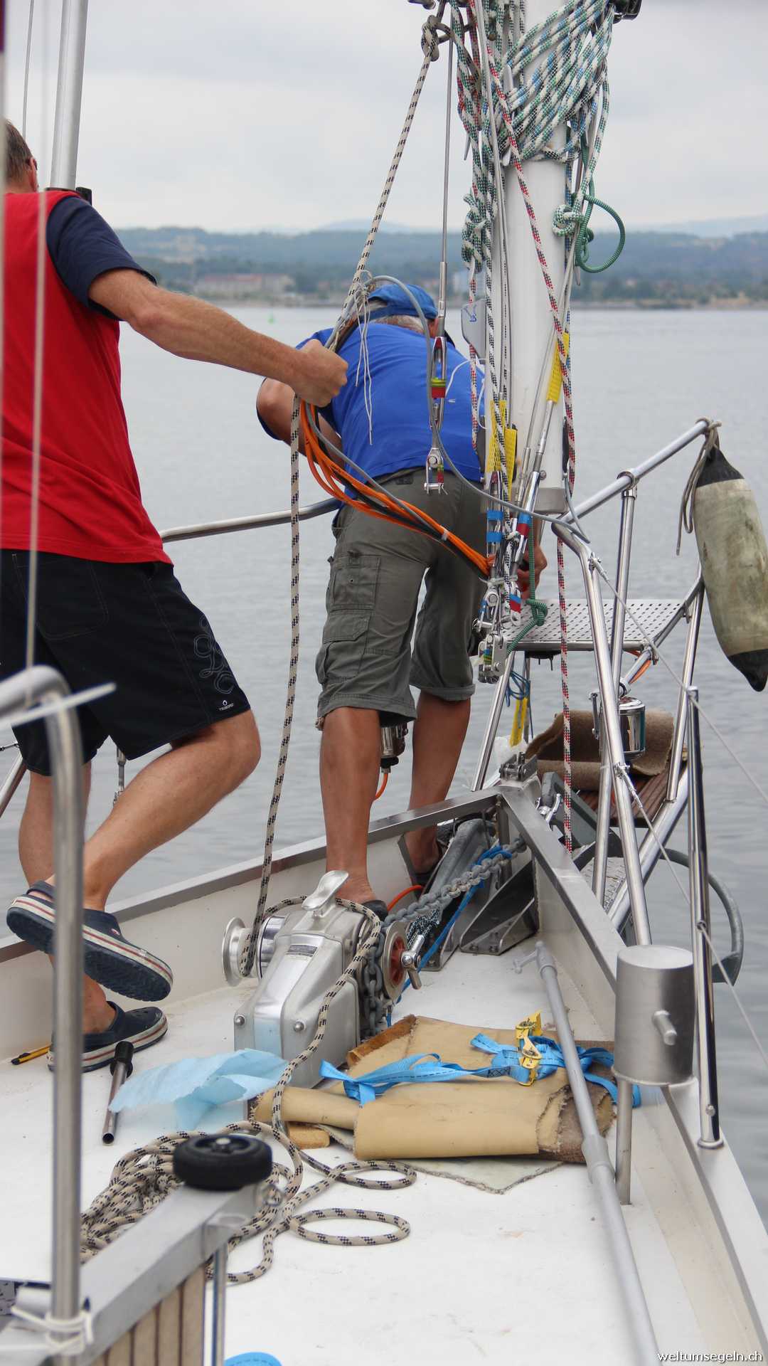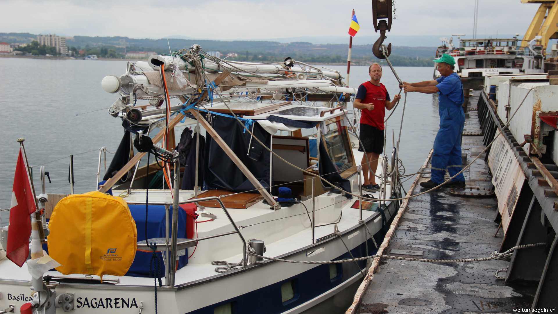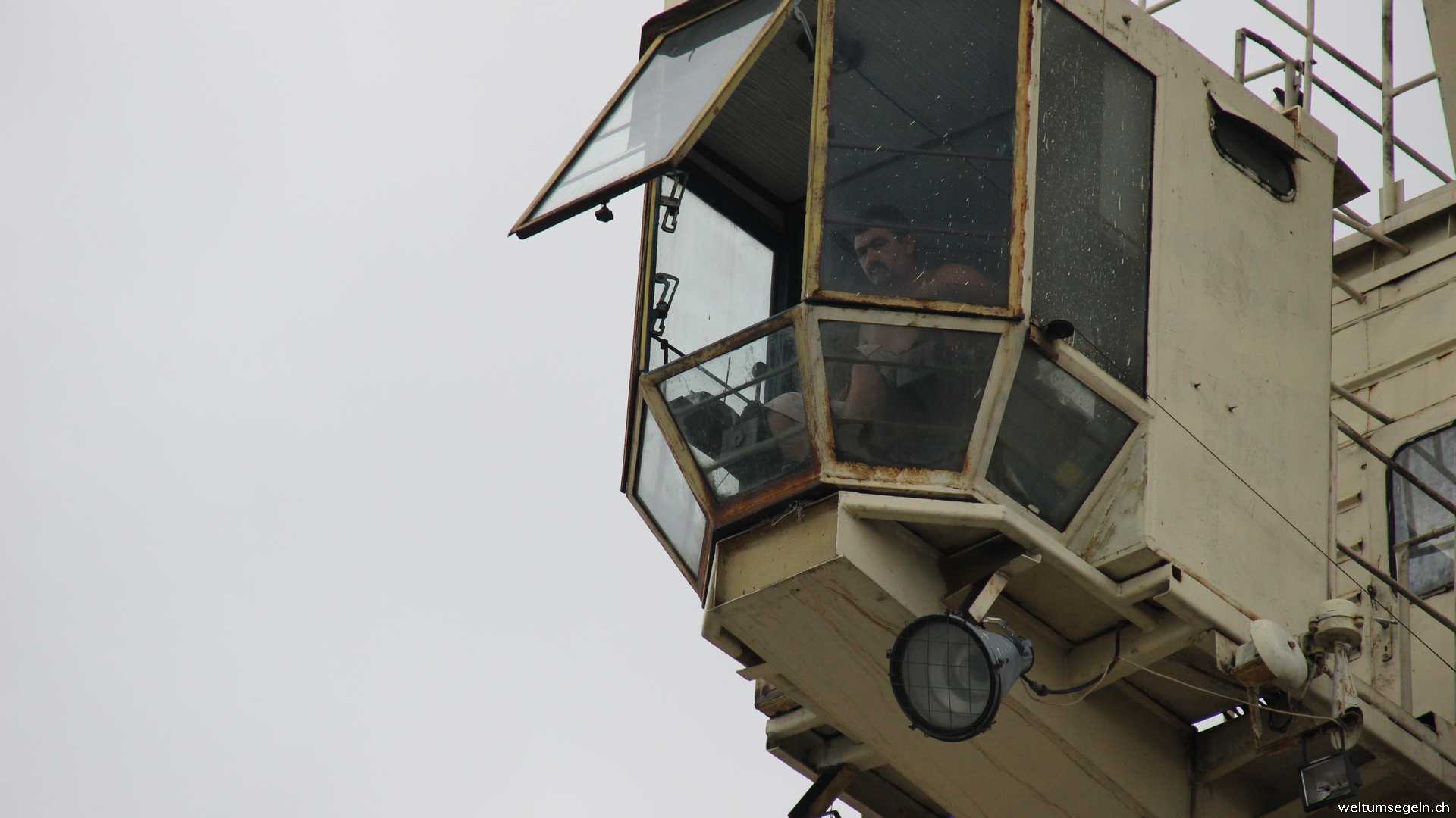 Wir überlassen die Kommandos an den Kranführer dem Mann aus dem Team von der Werft. Er ist mit auf dem Boot, arbeitet aktiv mit und denkt in die richtige Richtung. Ein Dankeschön und ein großes Lob an die Mitarbeiter und den Kranführer an dieser Stelle.
