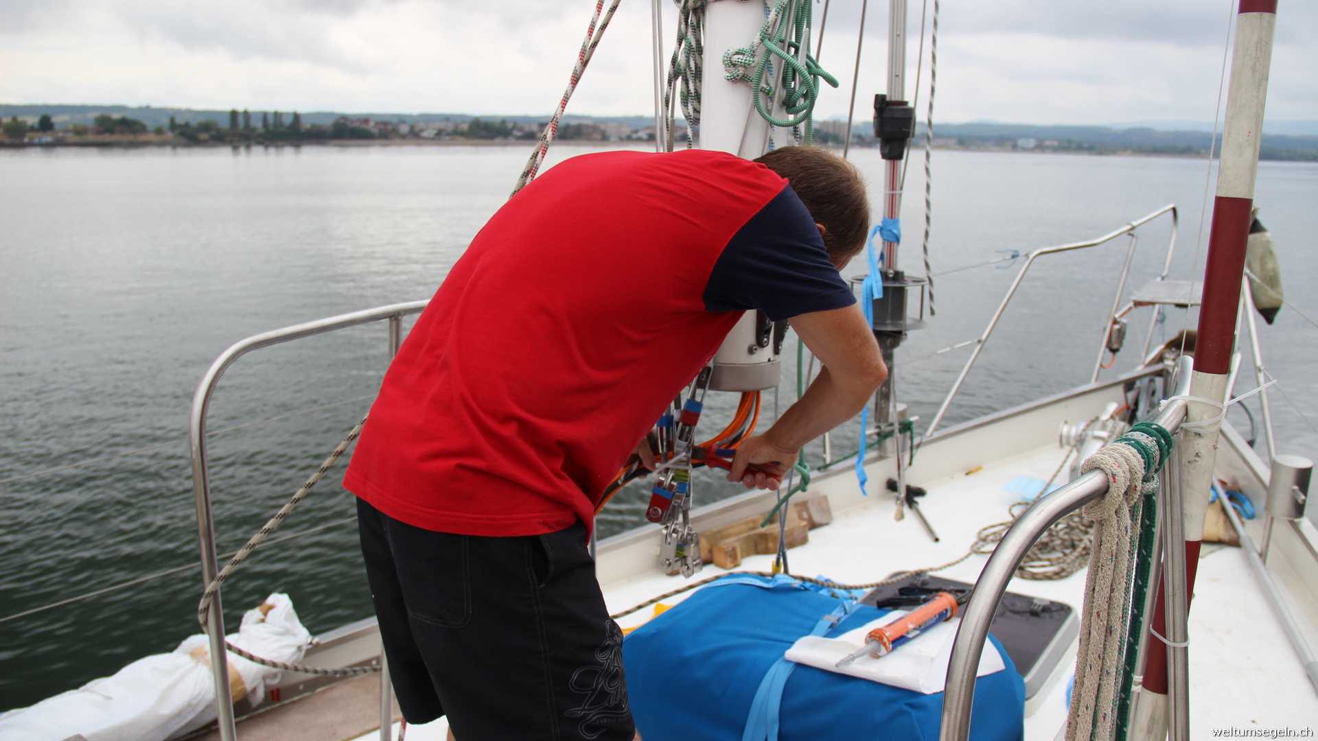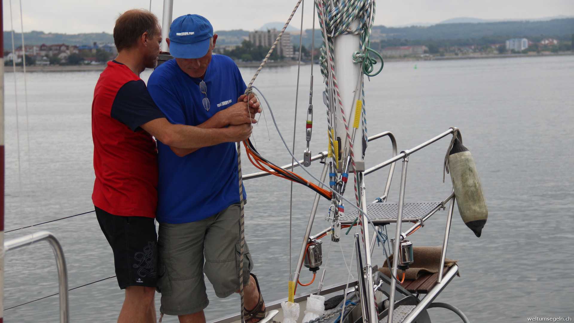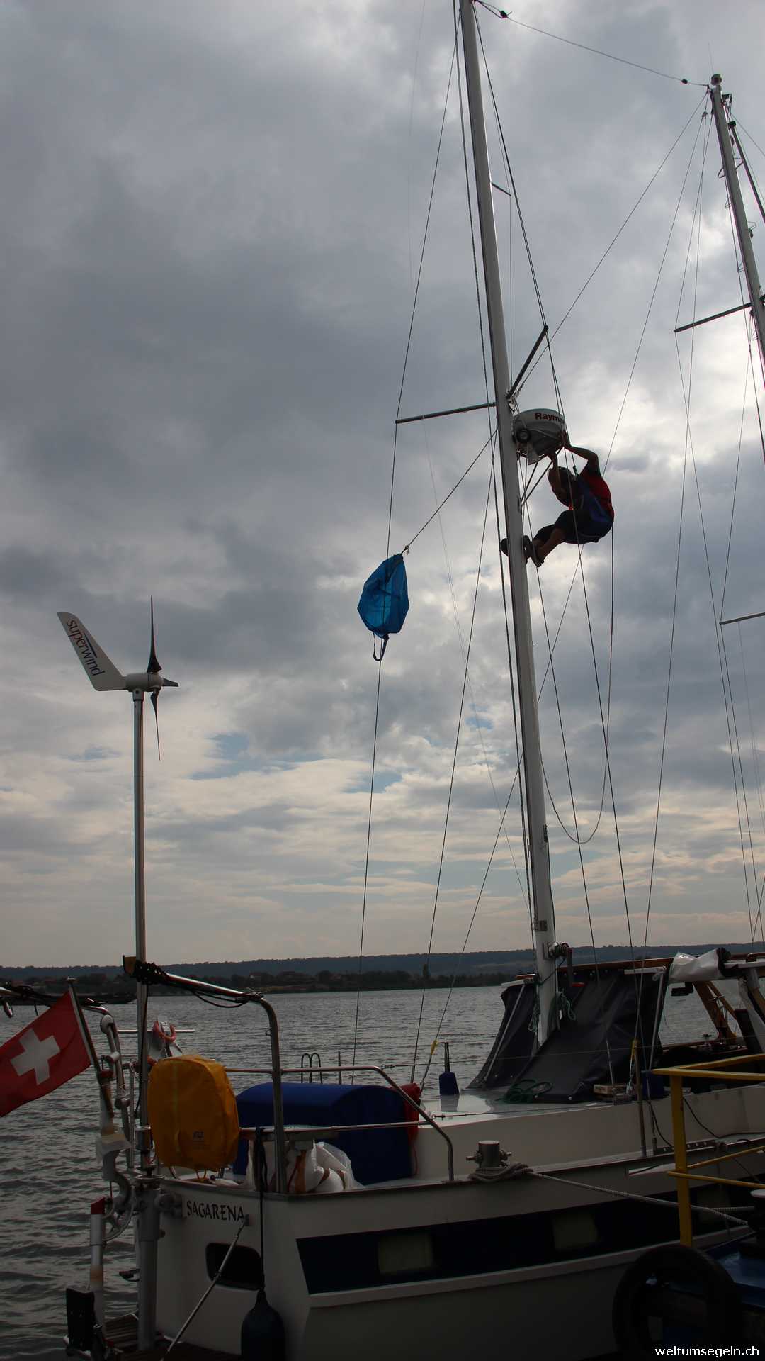 Es dauert ja doch eine halbe Ewigkeit bis das Rigg fixiert ist, Hubi im Mast die Kleinigkeiten erledigt hat und wir zu später Stunde zurück an den Anleger der Marina Aurora schippern.