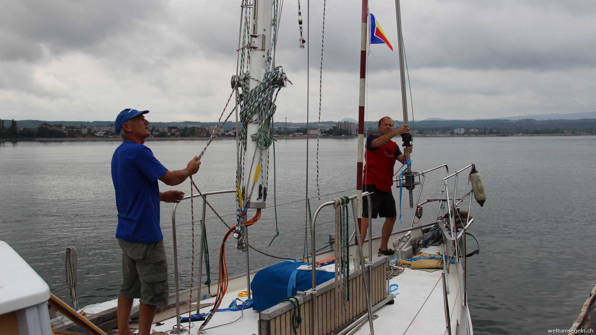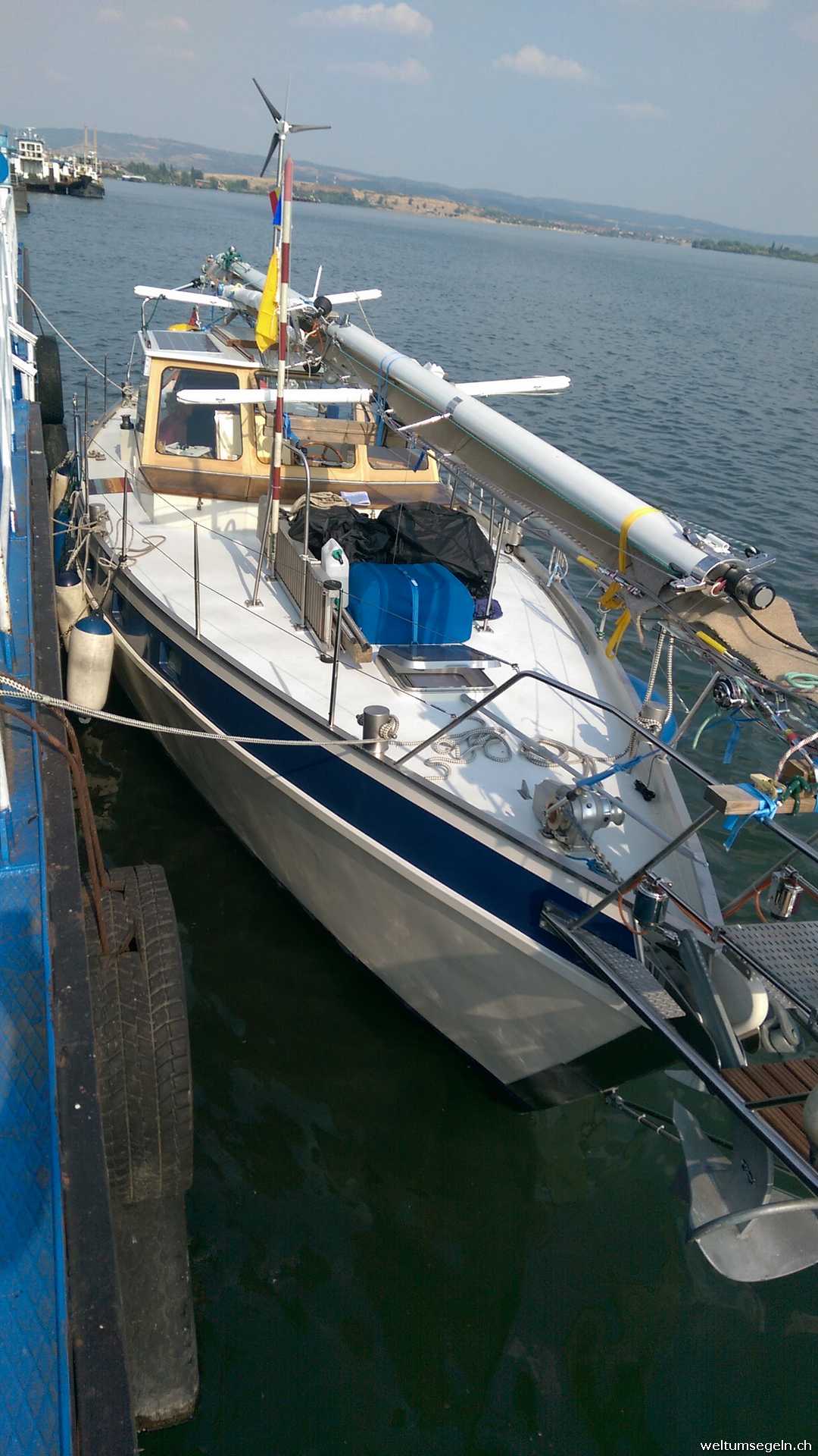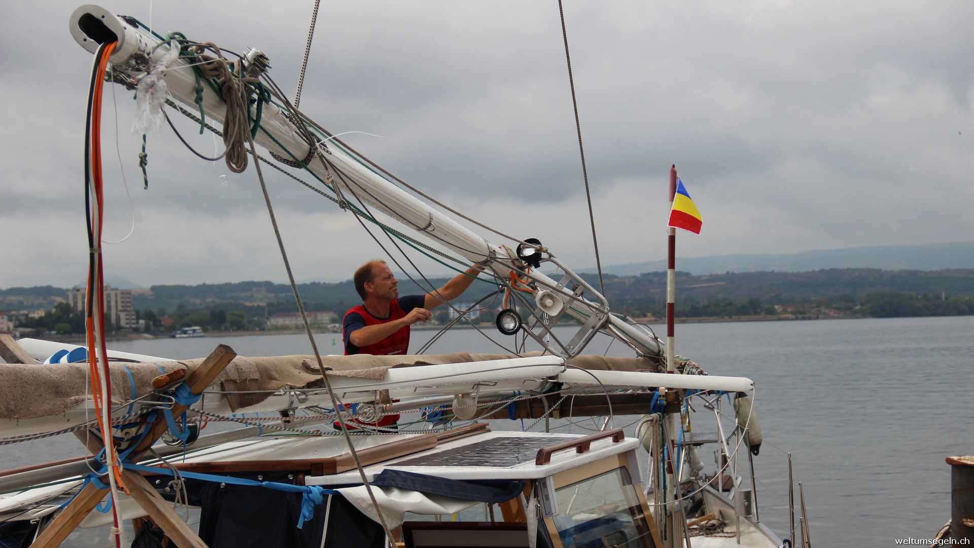Es dauert ja doch eine halbe Ewigkeit bis das Rigg fixiert ist, Hubi im Mast die Kleinigkeiten erledigt hat und wir zu später Stunde zurück an den Anleger der Marina Aurora schippern.