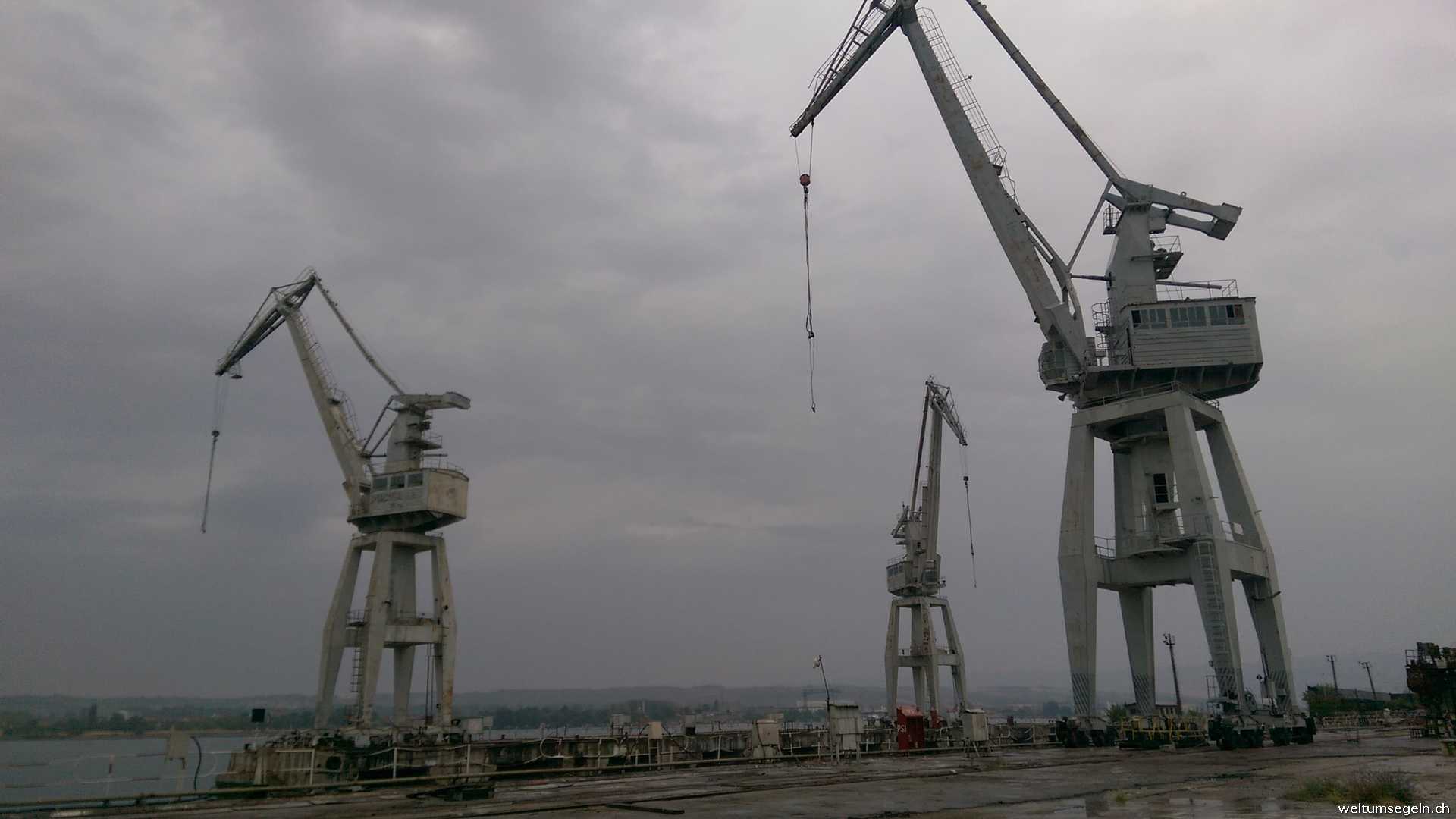Wir verlegen am nächsten Tag das Boot an die Werft. Es regnet cats and dogs. Das Vorbereiten des Riggs dauert den gesamten morgen. Es war alles gut verpackt und verschnürt. Es gibt Abfall ohne Ende. Mit dem Kranführer sprechen wir uns ab und es soll nach deren Mittagspause losgehen. Inzwischen scheint die Sonne ,die Temperaturen sind am steigen. Wir machen eine schnelle Pause zum Essen und bereiten weiter vor.Wir müssen noch einmal Sagarena verschieben , legen längsseits an einem Ponton an und harren der Dinge die da kommen.