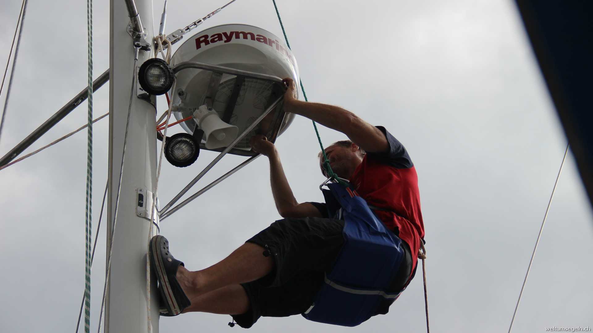 Beim stellen des Besan gelingt dies beim dritten Anlauf. Das absetzen des Mastfusses verhinder das zu hohe Kabelrohr welche im Mast darin anstößt. Nun wird der Besan wieder komplett nach oben gefahren , die mit Sika abgedichteten Kabelstränge müssen dazu mit nach oben und es entsteht eine ziemliche Ferkelei was das Sica angeht. Mit der Flex trennen wir 5 cm vom zu hohen Rohr ab. Erneut bringt der Kranführer den Besan in seine Position und mit einem Rums sitzt er auf dem Mastfuss auf.