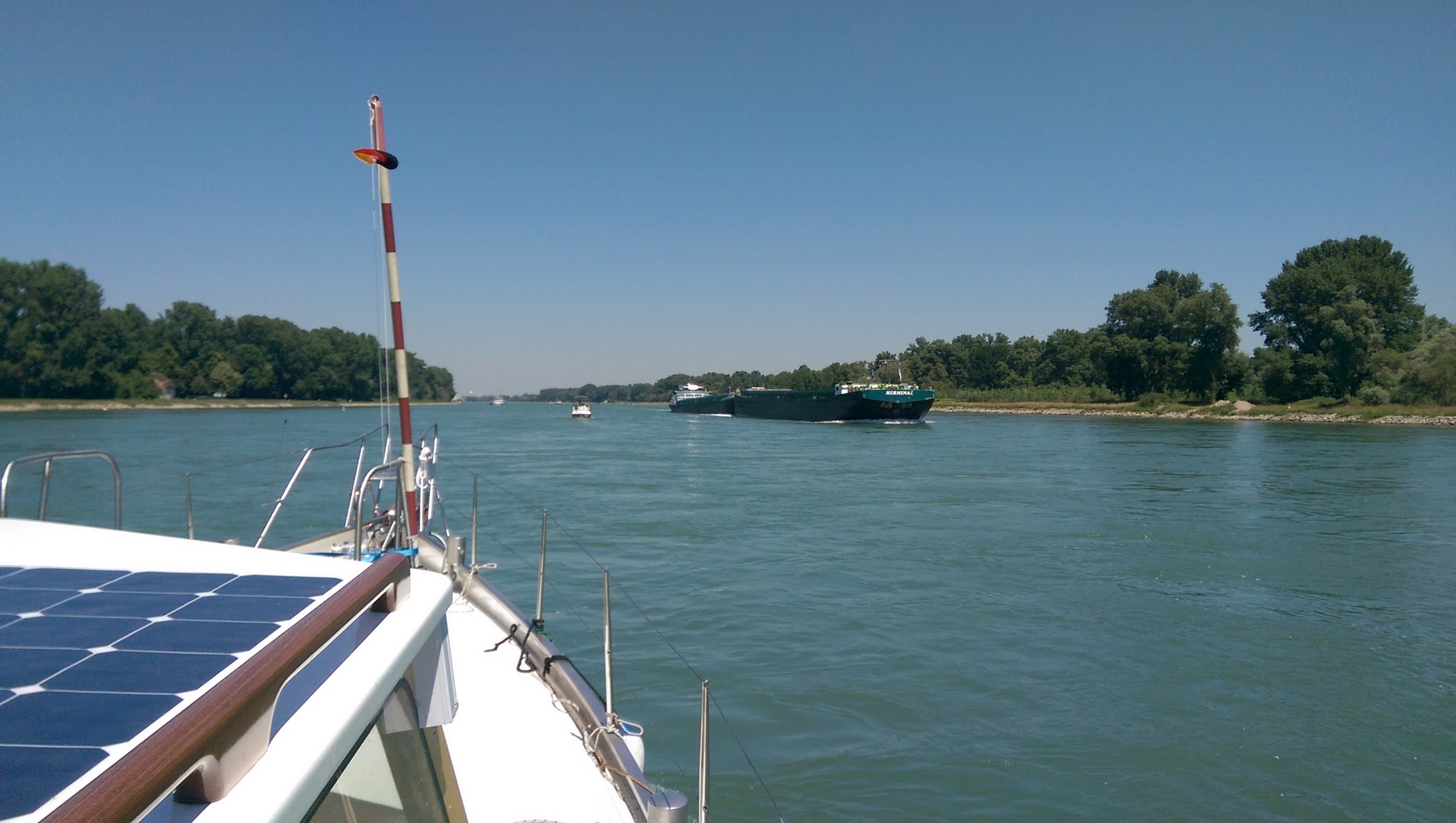 Von Speyer legen wir ab Richtung Mainz . Ein wenig mehr Schiffsverkehr erwartet uns bei Mannheim und in den kommenden Engstellen .Hier erfordert das Manöver des Überholt werden den drastischen Rückgang des Speeds von Sagarena um nicht vom kommenden Heck des Rheinschiffes abgedrängt zu werden.Hier fahren die Schiffe gerade um die Kurve.
