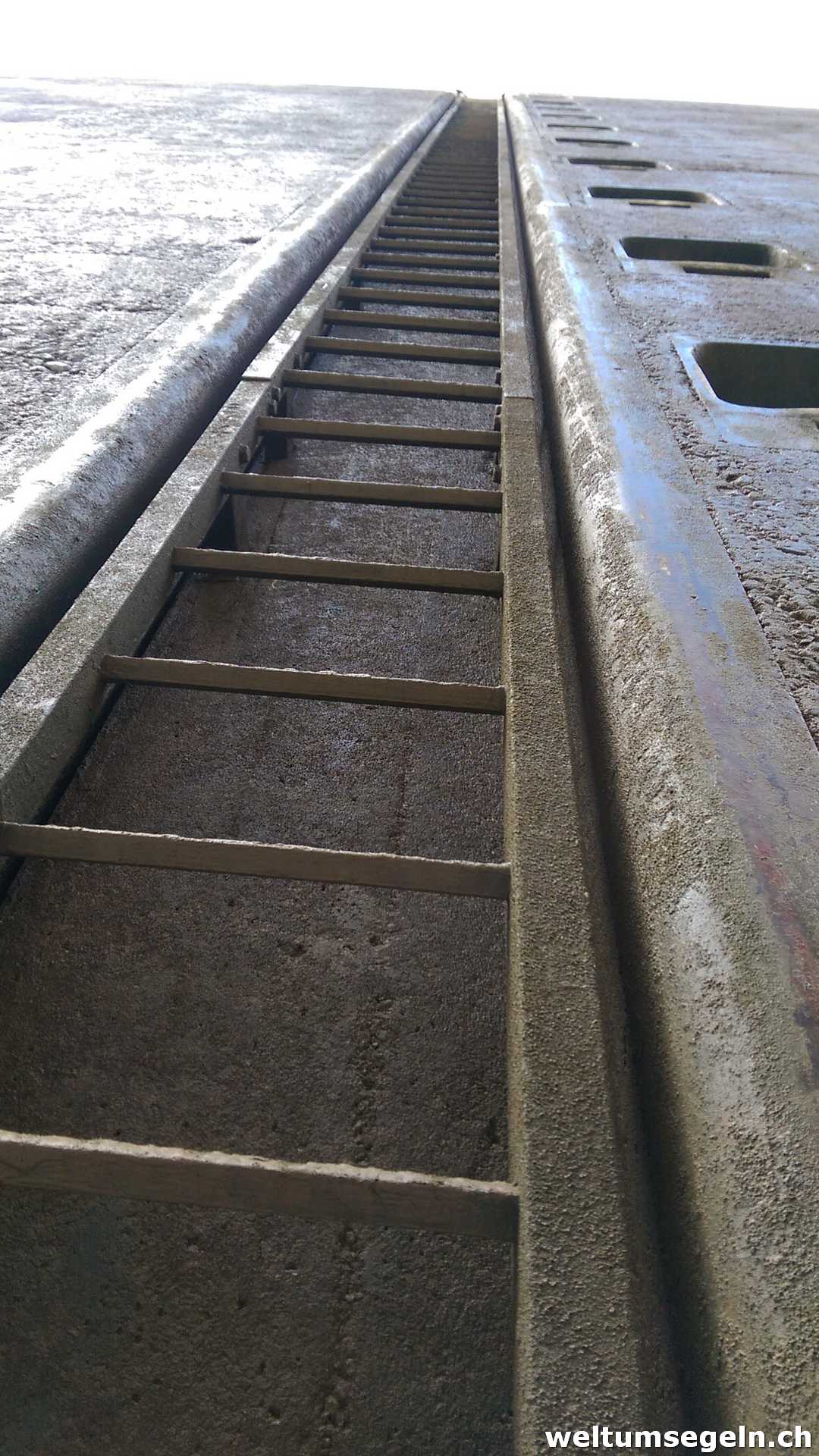 Fenderbrett, Fender, Leinen und noch eine Leine erscheinen manchmal aussichtslos zu sein. Den Bugsprie zieht es magisch an die Schleusenwand.
