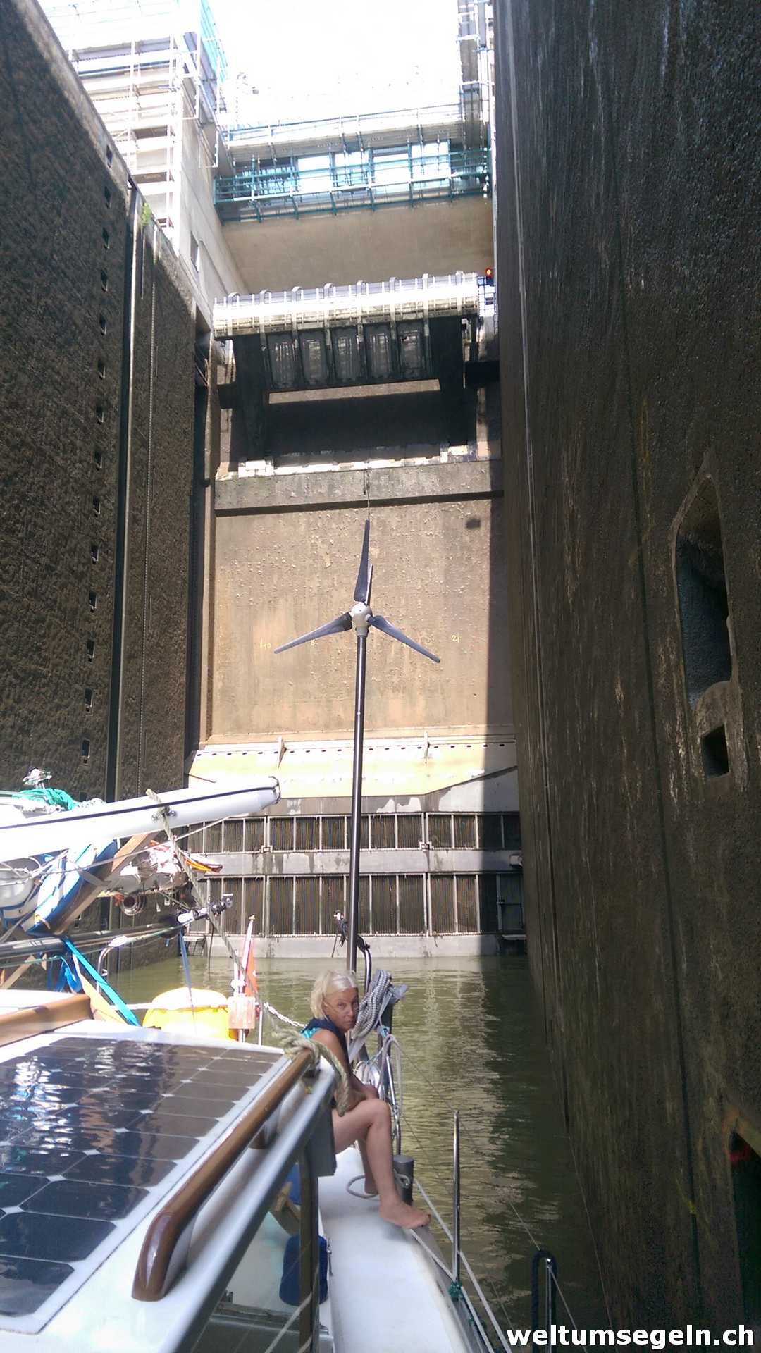 Das Schleusen wird nicht weniger. Wir sind auf Bergfahrt und mit jeder Schleusung werden wir ein Stückchen mehr den Fluss hinauf befördert. So fahren Schiffe den Berg hinauf.