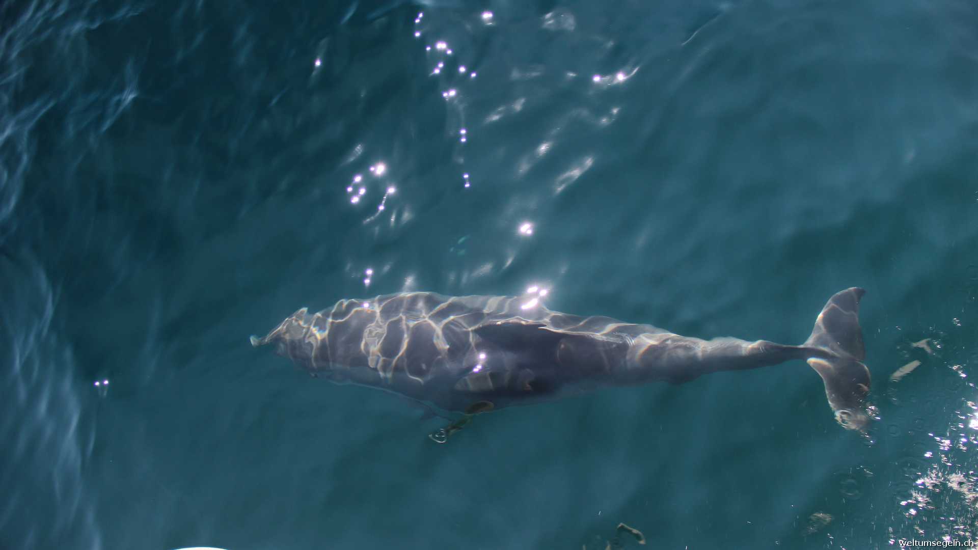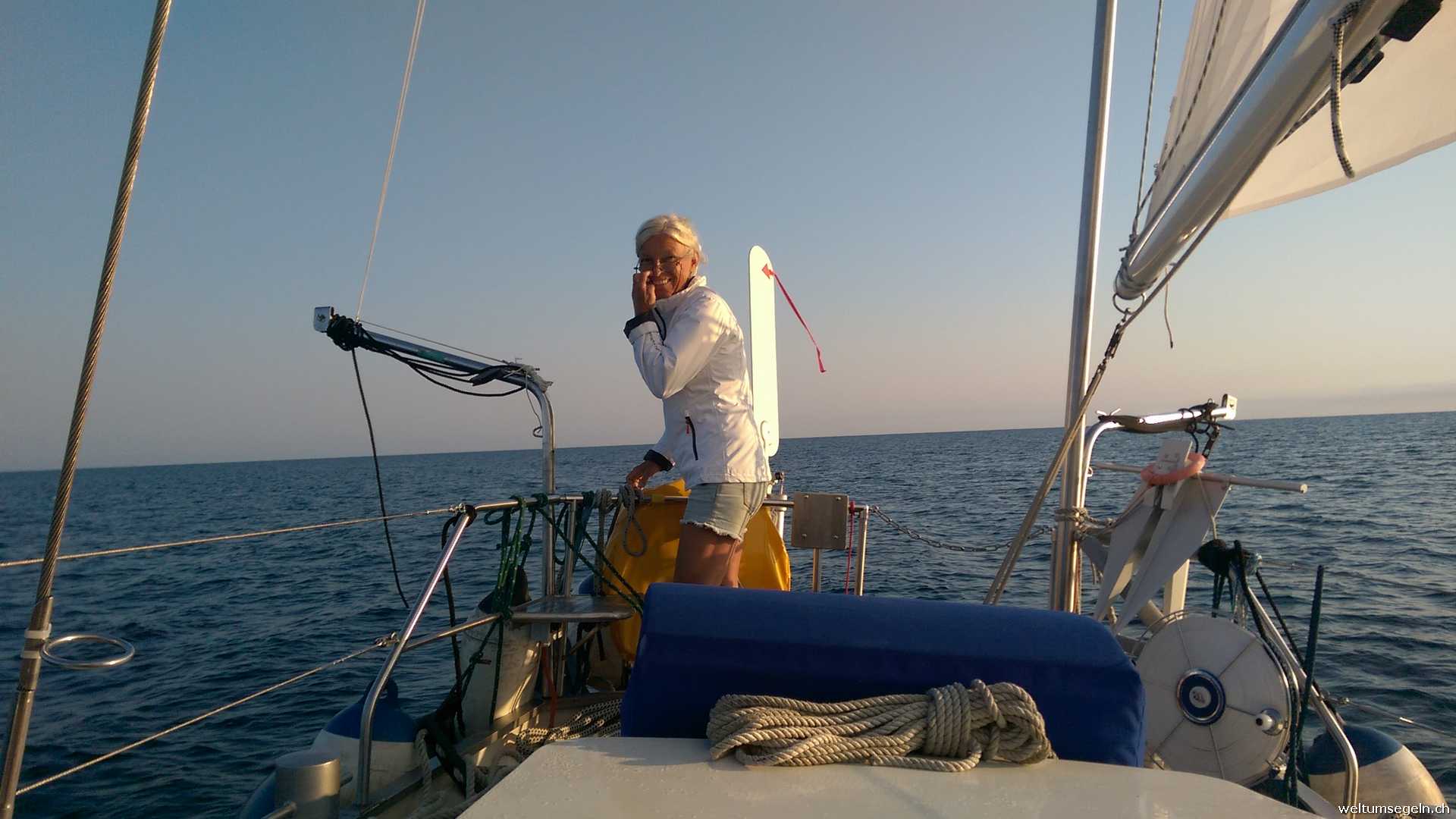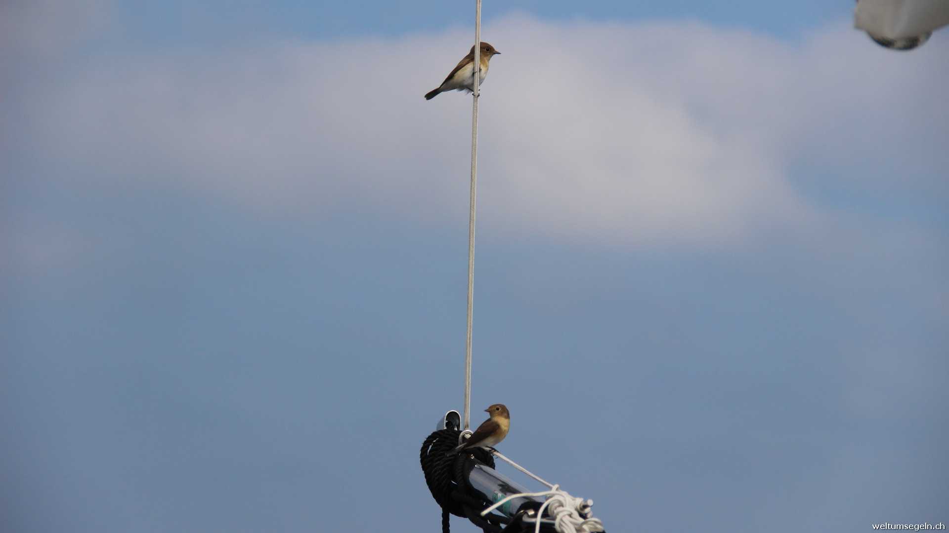 Dafür vertreiben wir uns einen Teil der Zeit mit dem beobachten von Delphinen welche uns des Weges begleiten. Vögelchen lassen sich auf Sagarena nieder und haben eine rechte Freude am Bugspriet im Segel herum zu hüpfen.