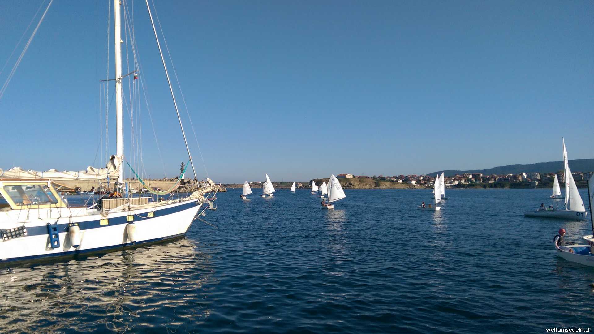 Bei der Einfahrt in den Hafen Tzarevo weichen wir den umherflitzenden Optimisten aus , steuern auf den winkenden Menschen an der Kaimauer zu und legen an. Die Polizei ist beim Empfang ebenso dabei.