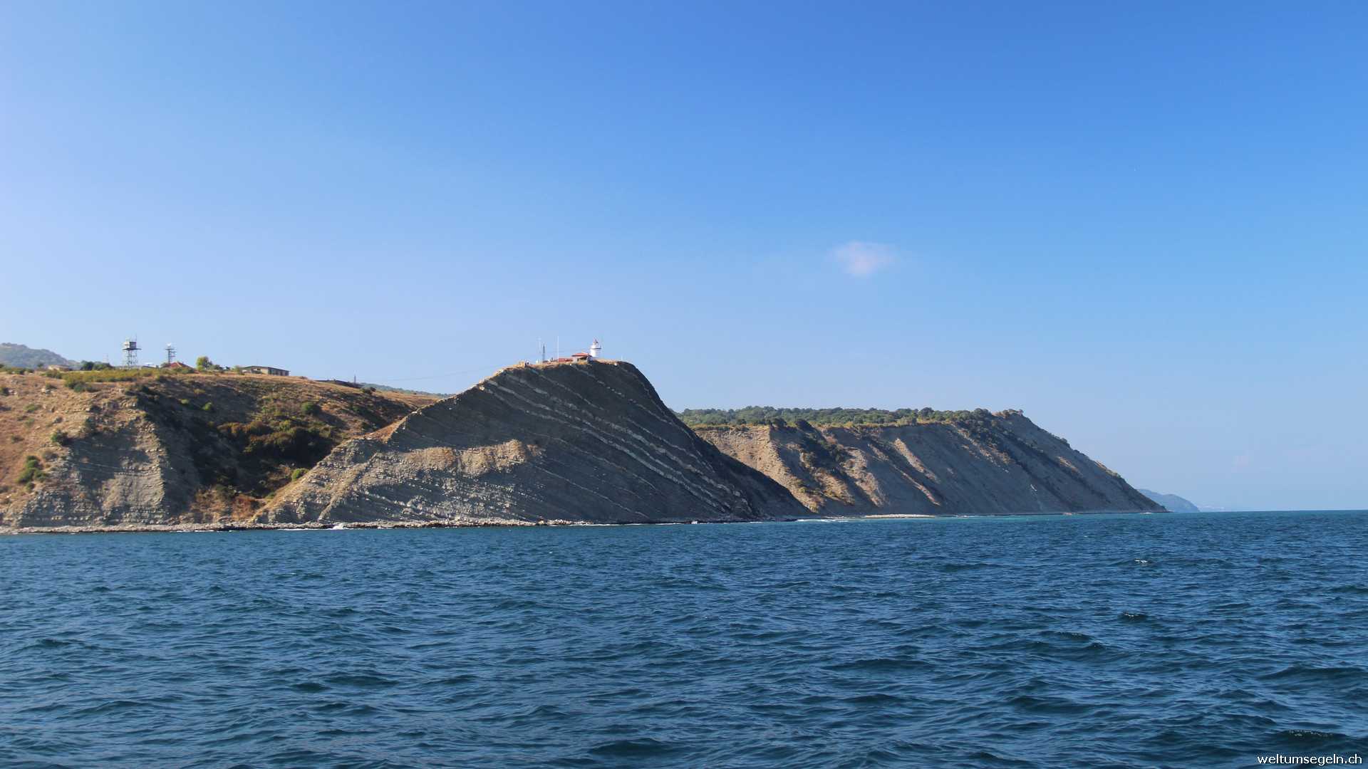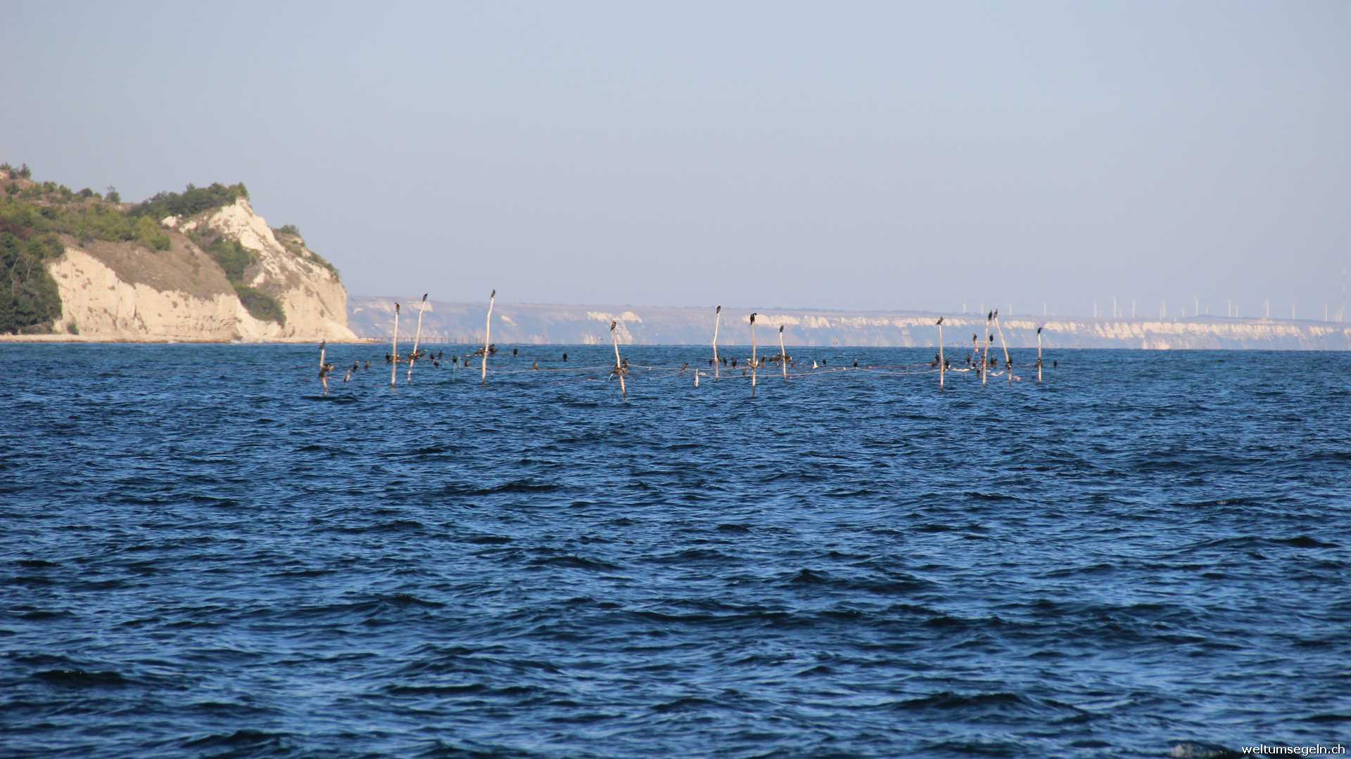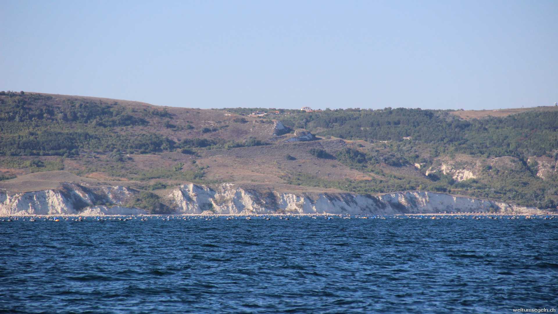 Weiter geht es die bulgarische Schwarzmeerküste entlang nach Balschik. Es liegen 48 sm vor uns. Unter Motor mit gesetztem Groß und Besan hoffen wir auf Wind aus der richtigen Richtung. Doch er mag nicht kommen. Am Kap Nos Kaliakar verlässt er uns ganz. Hier wechselt die Farbe des Meeres auf Smaragdgrün und wir überlegen ein kurzes Bad zu nehmen als uns riesengroße Quallen in häufiger Anzahl und auch immer wieder begegnen. Vorbei ist der Wunsch in das erfrischende Nass zu springen.