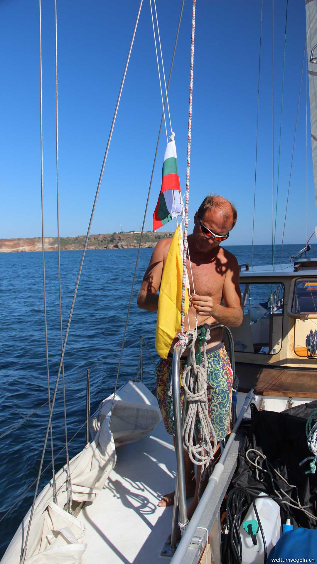 Zur Abwechslung stellt der Motor erneut ab .Wir beschließen die Dieselpumpe bei manueller Schaltung zu belassen . Nach ein paar Anlass versuchen und befüllen des Tagestankes Motoren wir weiter. Beim umrunden des Kaps Nos Emine bläst der Wind nur wenig mehr. Diese Highlight lassen wir uns nicht entgehen und segeln die letzten Meilen. Das bergen der Segel gleicht jedoch einem Balanceakt in der weiterhin bestehenden Dünung. Wir freuen uns über die kommenden Lazy Bags.