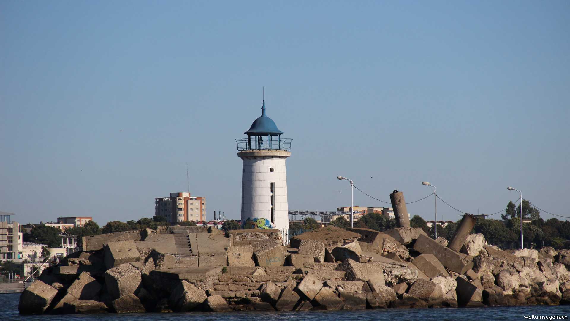 Wir verlassen Tomis Marina um 28 sm weiter nach Mangalia zu segeln. Doch der Wind ist nicht so ganz auf unserer Seite. Wir setzten zur Unterstützung Groß und Besan. Auch möchten wir die Segel begutachten. Keines passt nach den neuen Masten mehr so richtig. Die Genua lässt sich nicht durchsetzen und so schlagen wir die ältere Genua mit Stagreiter am Vorstag an. Das Groß spannen wir einigermaßen mit zusätzlichen Bändseln am Unterliek und das Fall schlagen wir mit einem Spierenknoten an um das Vorliek etwas mehr durchsetzten zu können.
